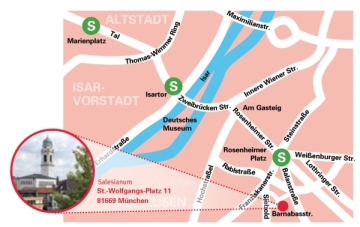 The Don Bosco Youth Hostel is located in Munich, in the Haidhausen district, just 5 min. away from the subway (S1-S8) and tram stop „Rosenheimer Platz“ (line 15 and 25). You can reach Marienplatz in just 3 min. and the central station in 6 min. by underground. Thanks to our great location in the city centre, you will be able to reach the most famous sights very quickly.